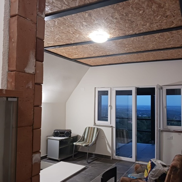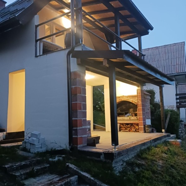 ( sagrađena pečenjara / roštilj na terasi, potpuno novi krov, zamijenjena stolarija ( PVC ), stiropor fasada, novi podovi i dovršena nova kupaonica ). Sve je namješteno. Na donjoj i gornjoj etaži koje su povezane unutarnjim drvenim stepenicama nalaze se natkrivene terase površine 15m2 ( gornja ) i 20m2 ( donja ) s kojih se pruža jako lijep otvoreni pogled. Kuća ima mogućnost ulaza i sa donje i gornje etaže, kao i prilaz parceli ( donja i gornja prilazna cesta ). Gledano od strane gornje pristupne ceste sastoji se od ulaznog hodnika, dnevnog boravka vezanog sa kuhinjom i prostorom za blagovanje ( open space gdje je središnji dio visok 3,5m, a kosina na bočnim zidovima počinje na 1,5m visine ). Tu je i novo natkrivena terasa i stepenice koje vode na donju etažu gdje je smještena jedna soba, hodnik, kupaonica s tuš kabinom i toaletom, donja natkrivena terasa gdje je smješten roštilj s jedne strane i vanjski sudoper / voda na suprotnoj strani. Tu je i spremište za alat cca 10m2. Moguće parkiranje 6-7 automobila. Zasađen je i mladi voćnjak. U jesen i zadnjih 500-tinjak m prilazne ceste bi trebalo biti asfaltirano. Uveden je vodovod koji se ne plaća, a kuća ima i septičku jamu. Vlasništvo je čisto. U obzir dolazi i zamjena za manji stan u Zagrebu od 35-40m2. Kuću je moguće iznajmiti za vikend proslave ili neki kraći period. Osim gotovinom moguća je i kupnja kreditima banaka. Obzirom da je obnova tek završena ( kako je vidljivo na slikama ) treba još urediti i očistiti okolinu kuće što će biti odrađeno od strane vlasnika.